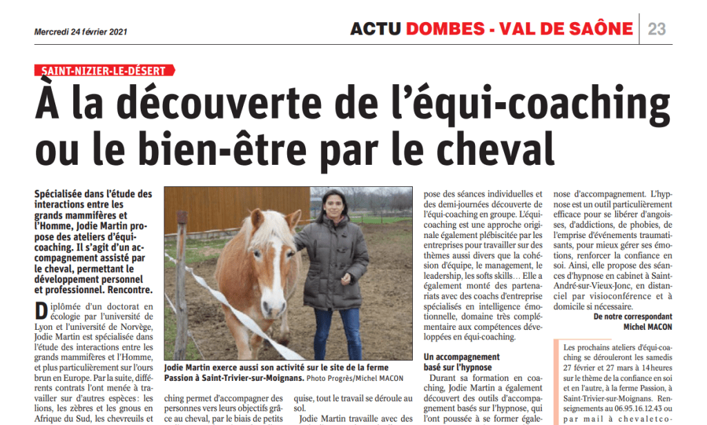 En ce début d’année je vous propose une réduction de 20% sur le prix des séances d’hypnose (Cabinet de Saint André sur Vieux jonc) et des séances d’equicoaching (tout public, à Saint Trivier sur Moignans).