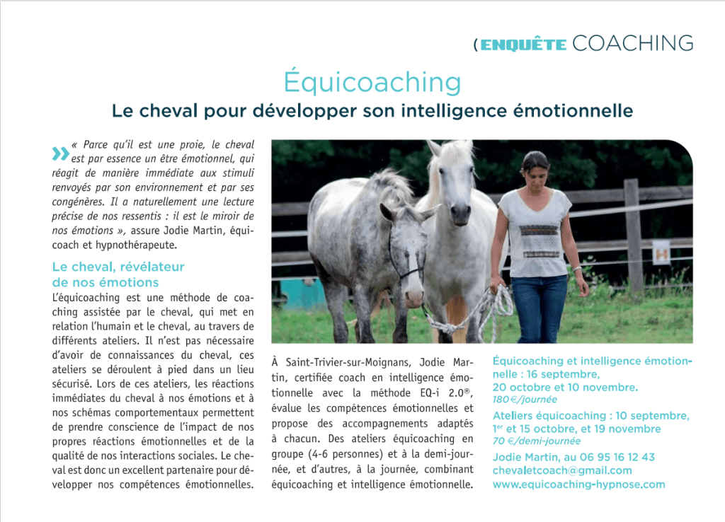 Article paru dans le dernier Magville (sept. 2022), sur l’équicoaching et l’intelligence émotionnelle, ou comment le cheval peut nous aider à développer notre intelligence émotionnelle.