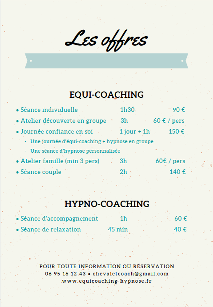 Je propose des cartes cadeaux pour offrir des séances d’équi-coaching, en individuel, en couple, en famille, et des ateliers en groupe, pour la découverte des vertus de l’équi-coaching, ou sur des thèmes spécifiques tel que la confiance en soi. Pour cet atelier je propose un alliage d’équi-coaching et d’hypnose pendant une journée, en groupe, suivi d’une séance individuelle d’hypno-coaching.